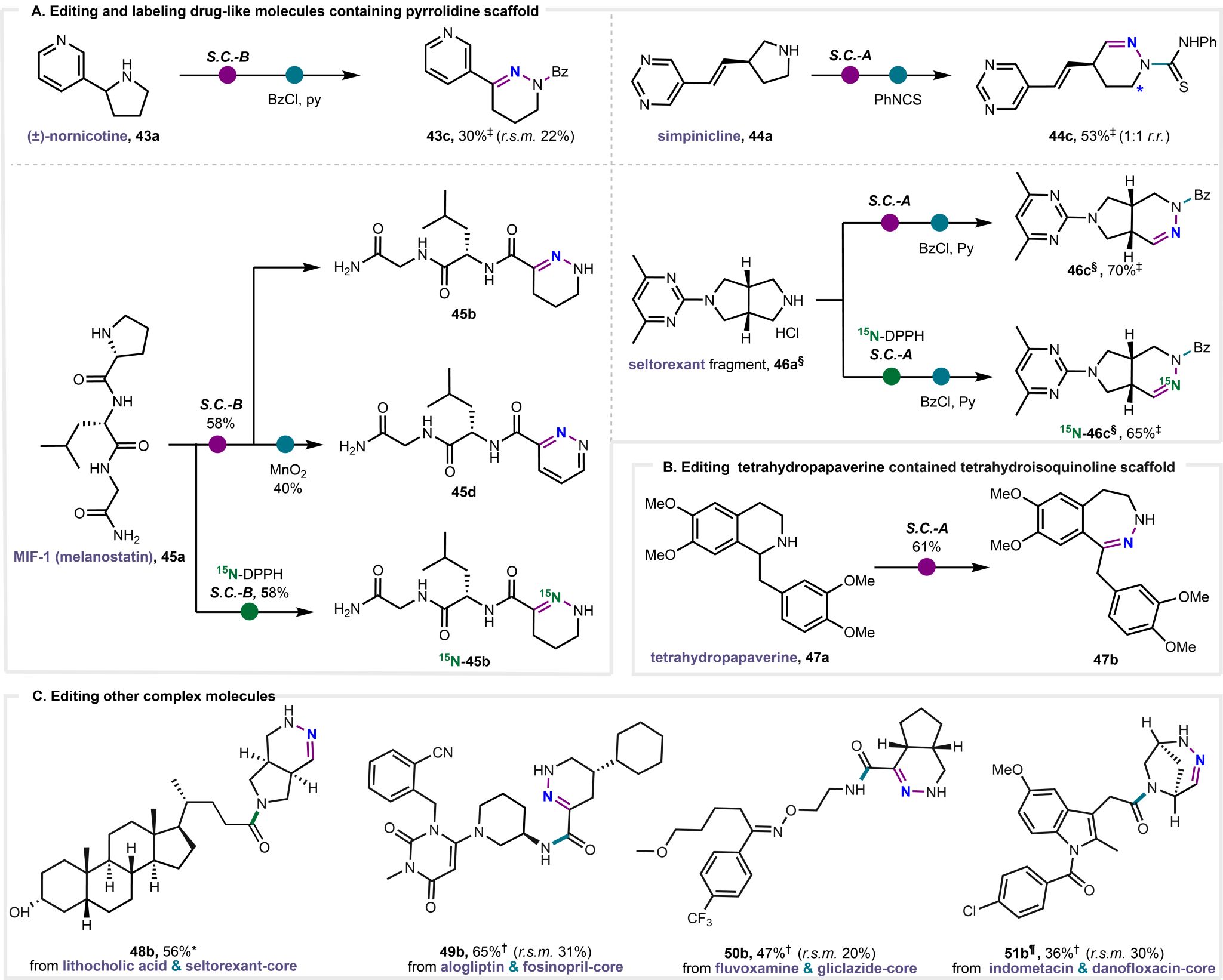随后团队将该氮原子插入策略直接应用于复杂活性分子与同位素标记上(图4)。作者对(±)?降烟碱、simpinicline、三肽 MIF?1 及 seltorexant 片段实现了高效插氮,并借15N?DPPH 将15N一步嵌入药物分子中,为后期代谢及药效追踪提供便利。此外,含四氢异喹啉的天然产物四氢罂粟碱也能被扩环为七元二氮环,显示该策略对不同环张力体系的普适性。